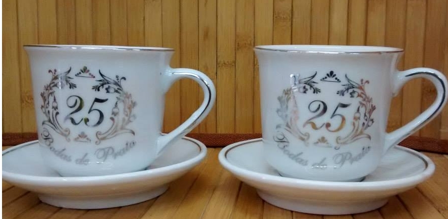 conj. de xícaras ref. 034068 Conjunto de xícaras c/pires 200ml. 2 pç. Bodas de Prata - Porcelana Lú