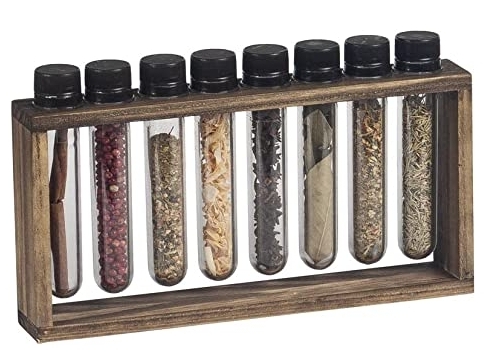 Porta tempero c/suporte ref. 0021122 Kit para tempero com suporte de madeira 8 potes de vidro tubo - Stolf