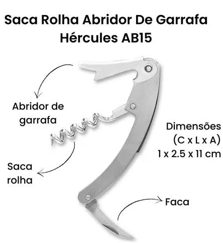 Abridor/saca-rolhas inox ref. 030460 Abridor/saca-rolhas/canivete inox - Hercules