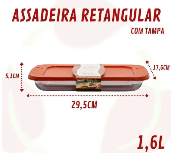 Assadeira retangular de vidro refratária com tampa 1,6L. 29cmx15cmx4cm