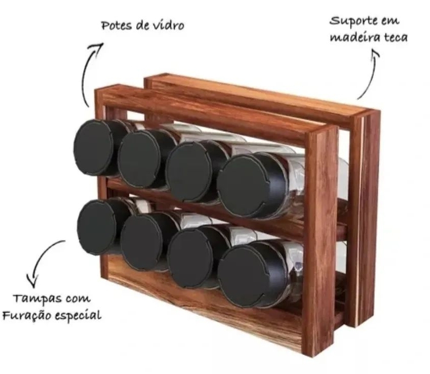 Porta temperos com 8 potes de vidro suporte de madeira